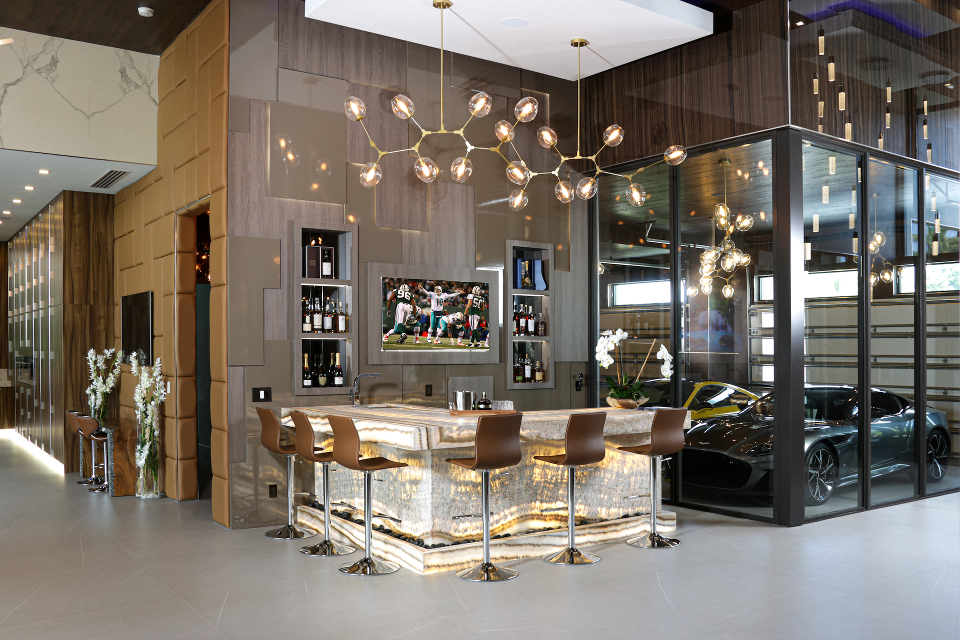 Dayoris used rich dark Stained Walnut Veneers to manufacture these oversized Filo Doors. The master bedroom was designed with an oversized Filo Muro Frameless Door closing flush against a matching paneled veneer wall. Brilliant Square Chrome Italian Hardware was installed in order to stand apart from and showcase the oversized Walnut Veneer Doors. Behind the bar Dayoris installed a 3D, LED backlit wall panel system, using a heavily grained German Laminate.