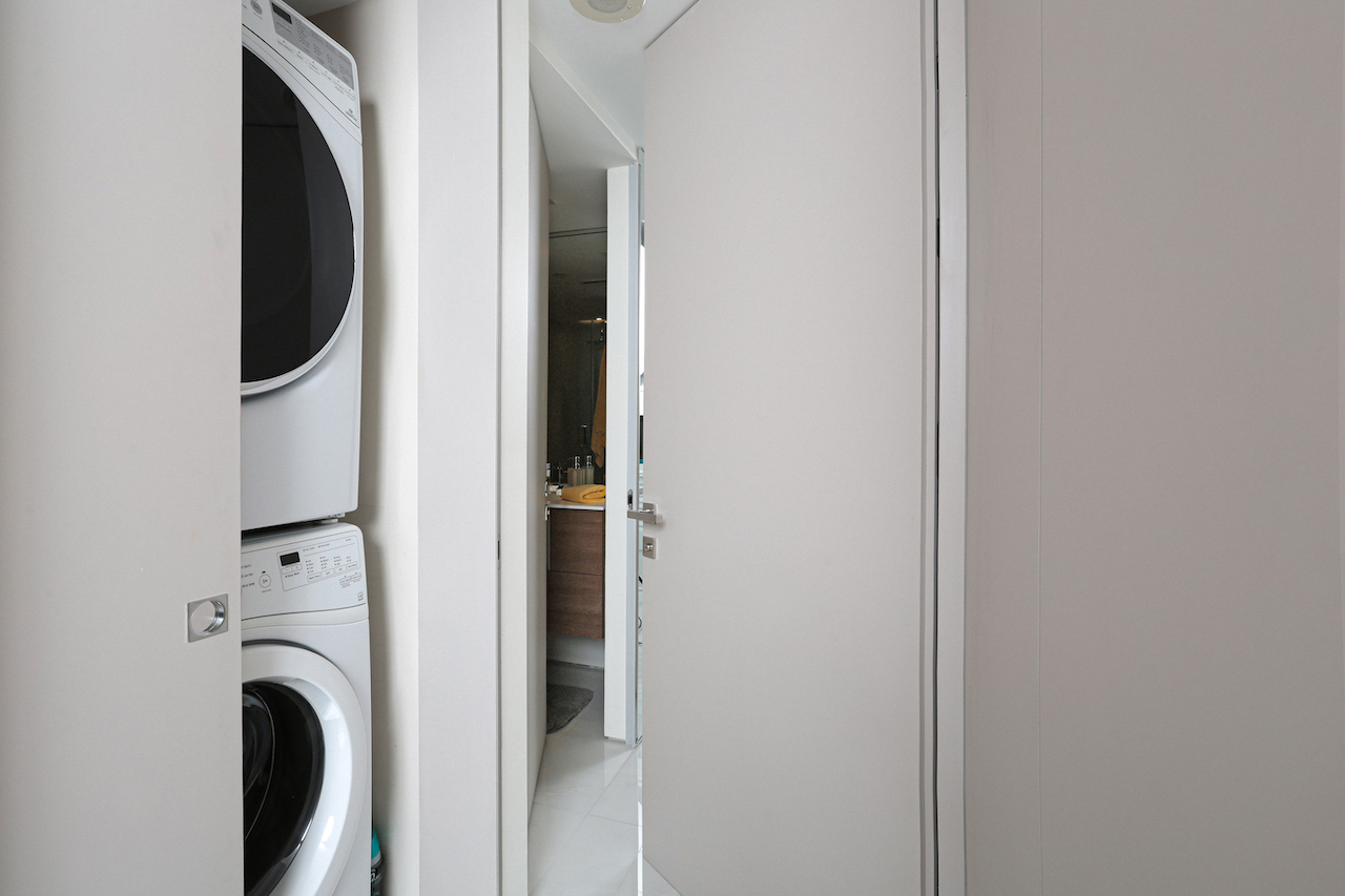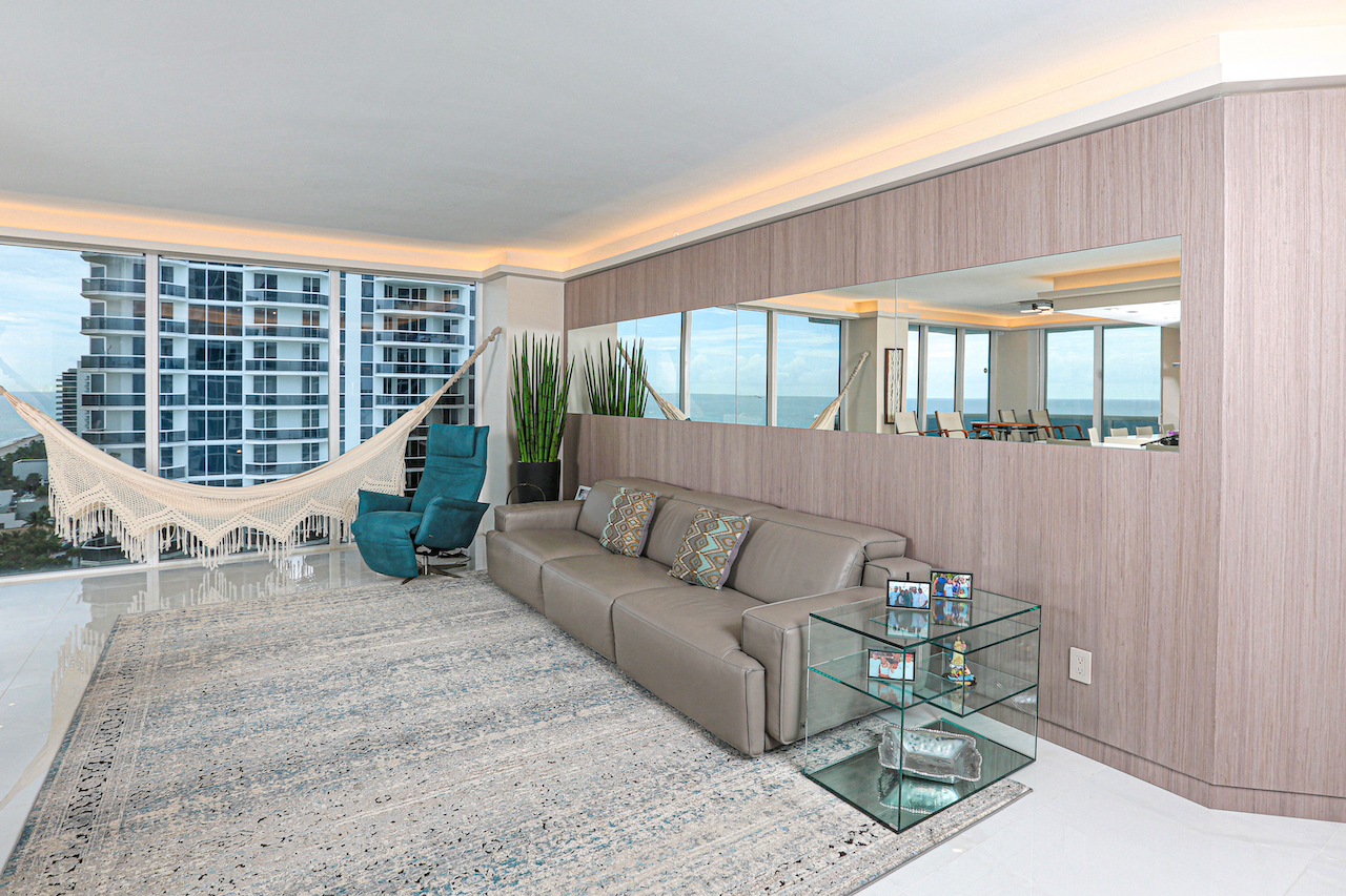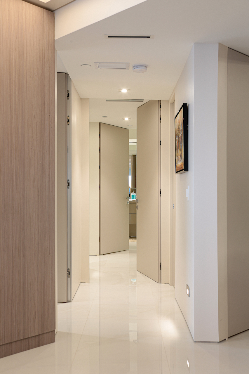 Brazilian Architectural firm ARCHITEXTURE designed this contemporary hi-rise apartment using a combination of DAYORIS European Lacquer, Filo Muro, floor to ceiling doors. These flush frameless doors were manufactured to work in coordination with the custom backlit “3D” paneling installed along the entrance wall of the apartment. The living room wall paneling was installed using a stained wire brushed Italian oak Veneer incorporated with mirror. The design intent of the Dayoris Flush Doors and mirrored wall paneling was to bring a sense of height and volume to the apartment. To further enhance the feeling of volume the apartment was designed without baseboard, incorporating a Fry Reglet reveal.