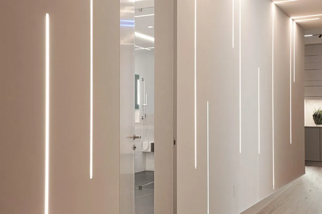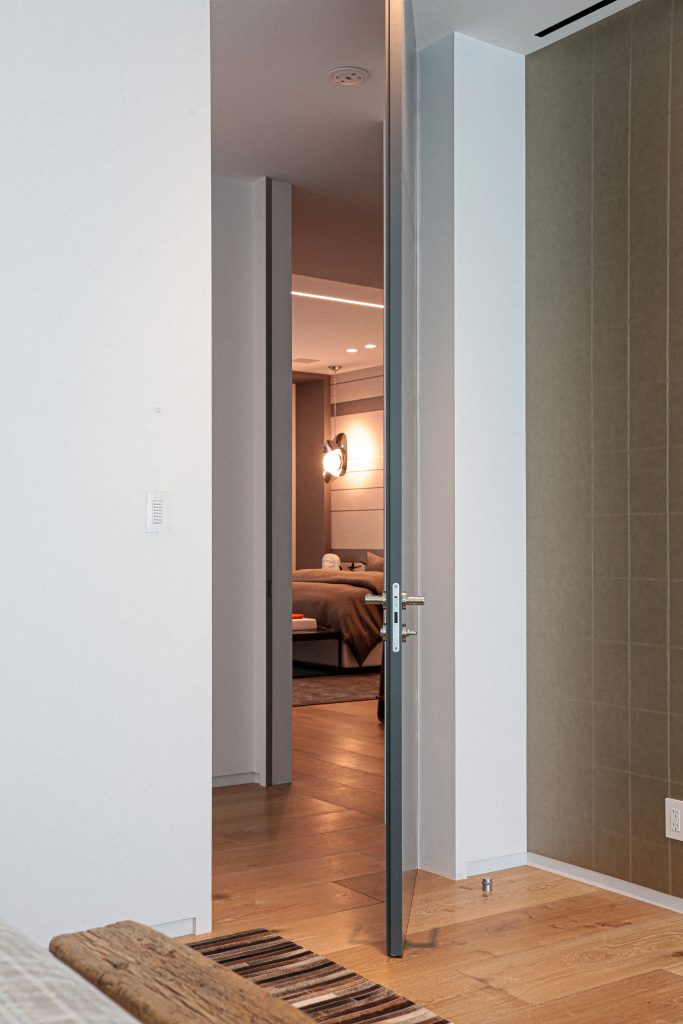 For instance, our floor-to-ceiling pocket doors provide a seamless appearance that complements the architect’s vision. With only a minor gap at the top and bottom of the door. We offer an array of customization options and finishes, such as primed, lacquer, laminated, wood veneer, or special cladding.