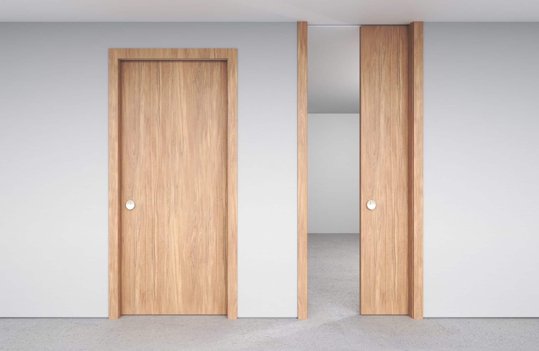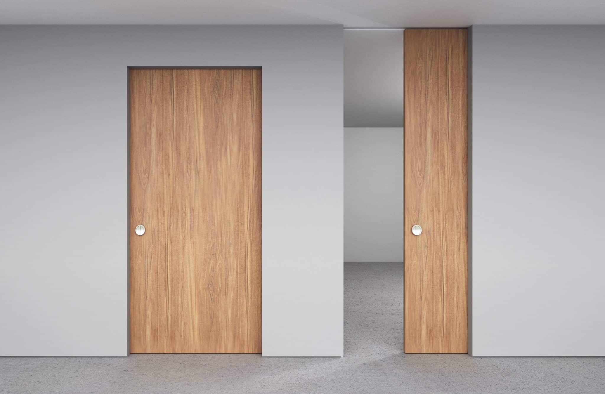 Our Modern Pocket Door features high pressured Italian laminate, selections of reconstituted wood veneers, matte and high gloss finishes and lacquered paint in an array of colors.