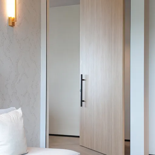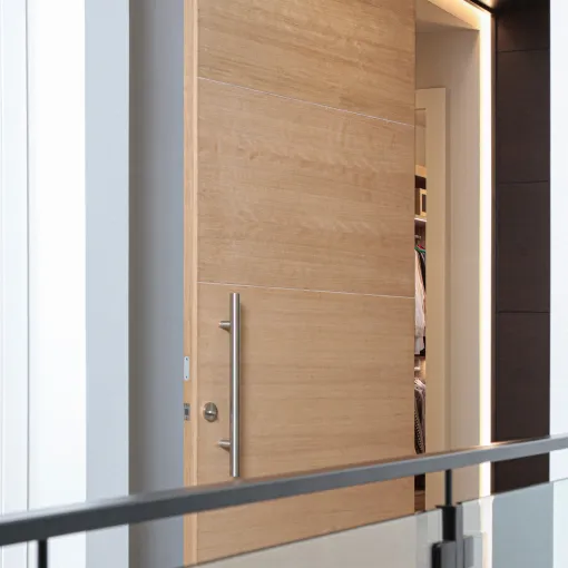 This sprawling contemporary suburban home was designed to display magnificent Dayoris Filo Muro doors, finished in a Dark German Walnut Laminated finish. The finish choice was made with the design intent to compliment the black anodized metal and glass doors installed throughout the home. Square Chrome handles with a Dayoris magnetic mortise set were used to accent the dark finish of the frame-less doors. The Walnut Doors were manufactured with “V” grooves cut into them for a special detail complimenting the book-matched vertical grain. The Dayoris Filo Muro Doors in this home serve as a pallet for the contemporary design finishes throughout.