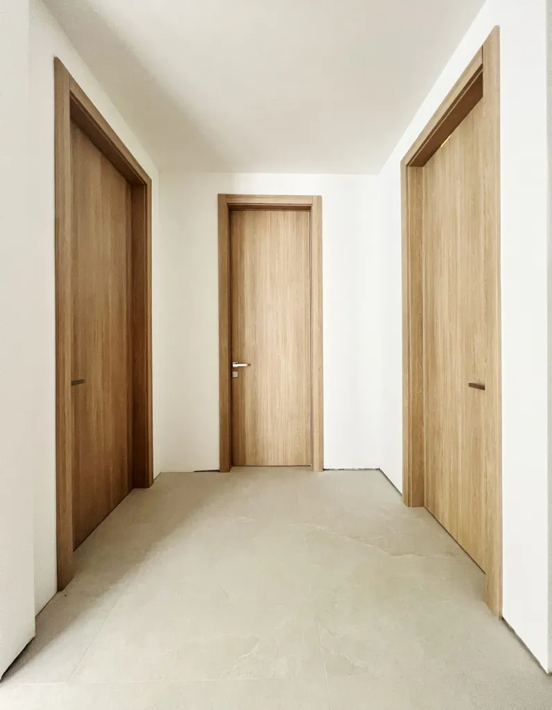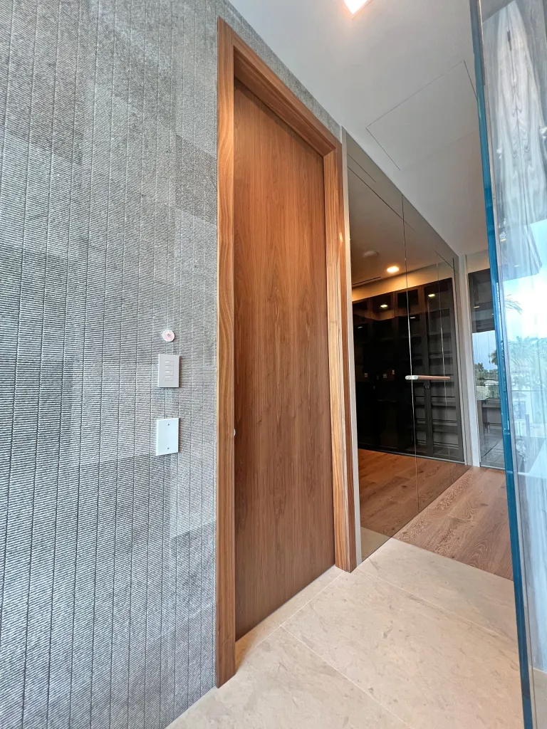 The complete wrap around wood casing of the Rossore door profile exudes the feeling of fine Italian woodwork and craftmanship. With the DAYORIS proprietary slim aluminum frame installed in conjunction with the Rossore door and frame system, the Rossore swing door induces a look of volume, while maintaining clean lines and contemporary appearance.