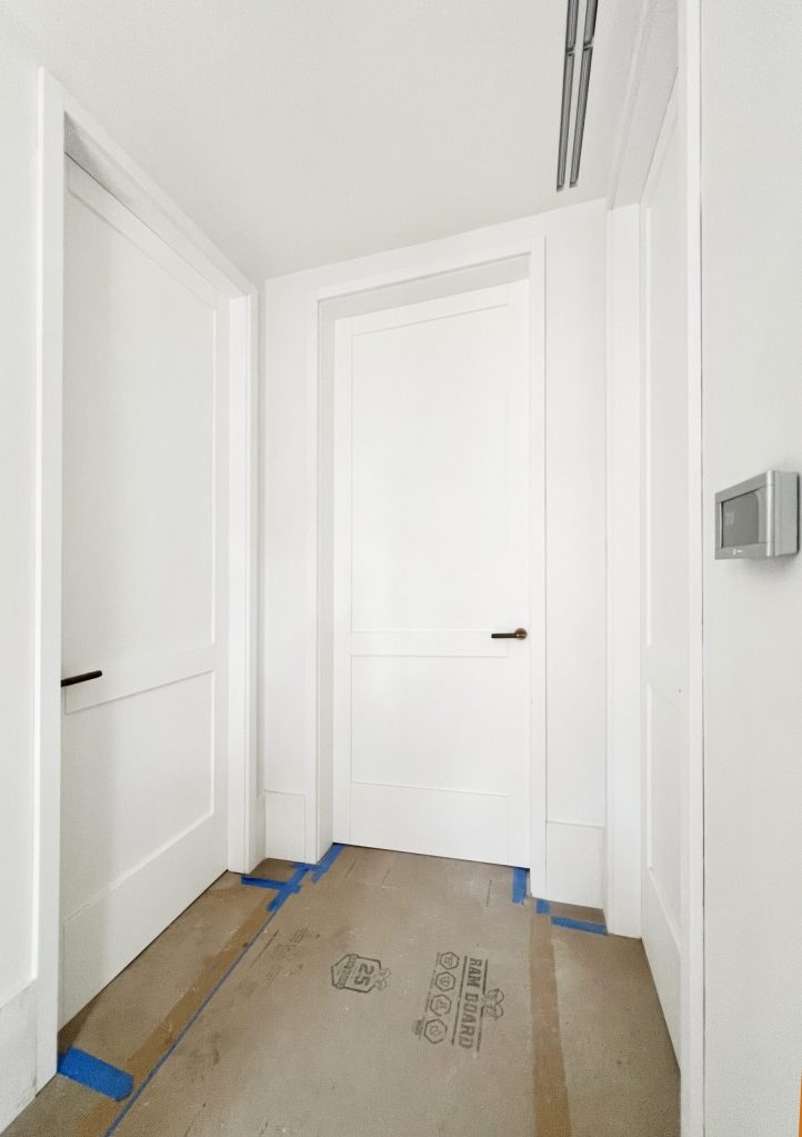 The casing of the door sits proud of the adjacent wall accentuating a coplanar shadow effect between the door and casing. The square contemporary casing will exude a clean sense of contemporary design.