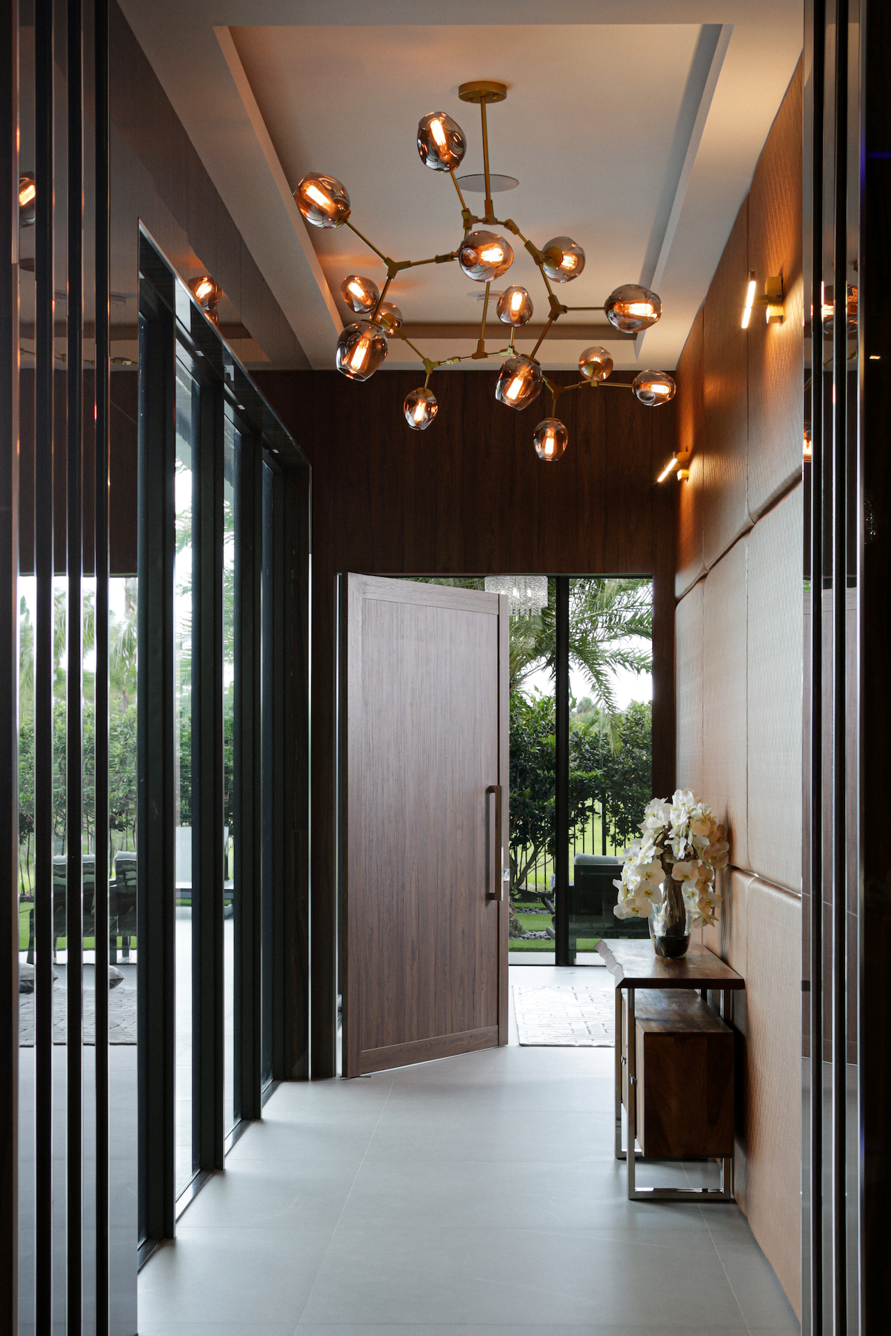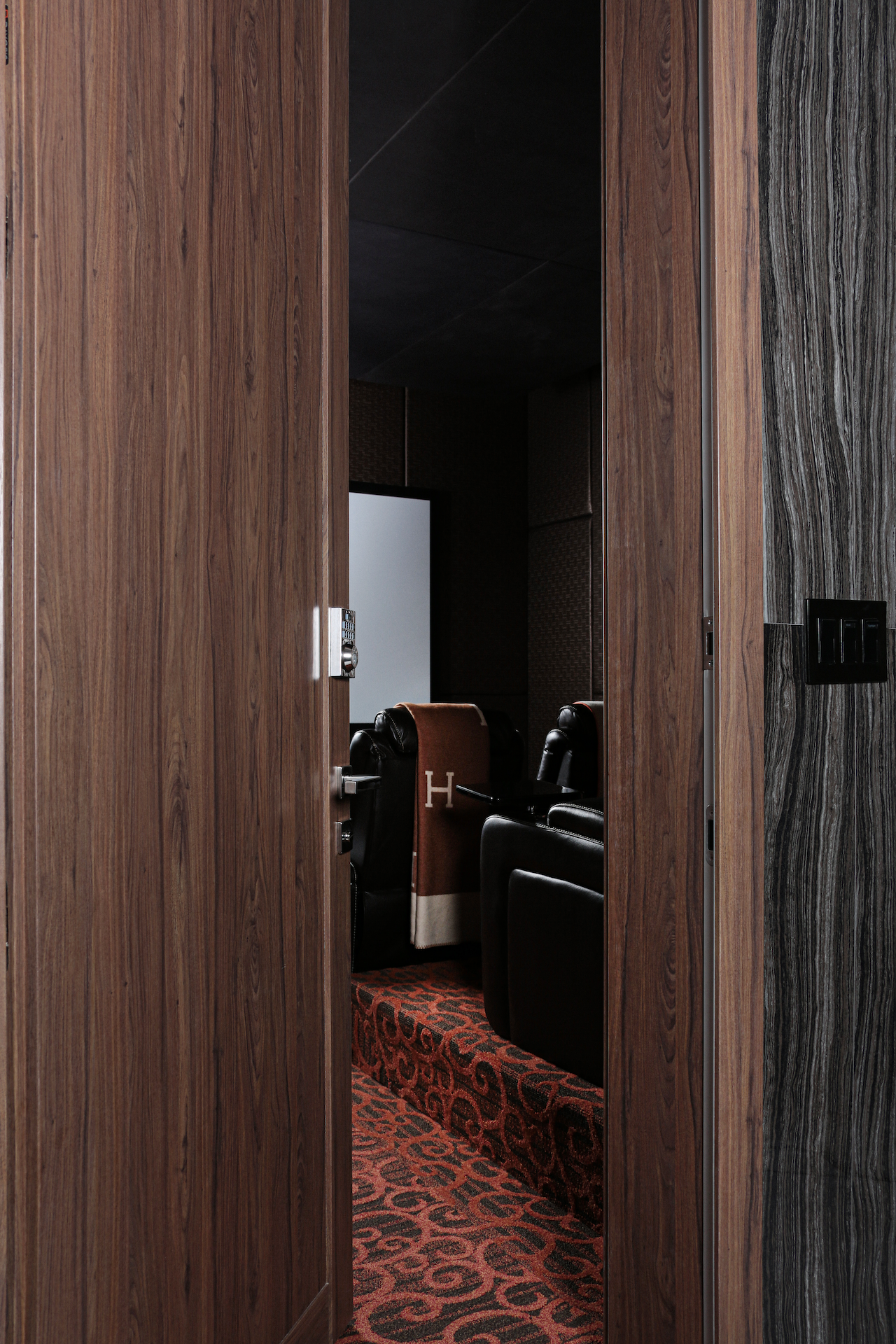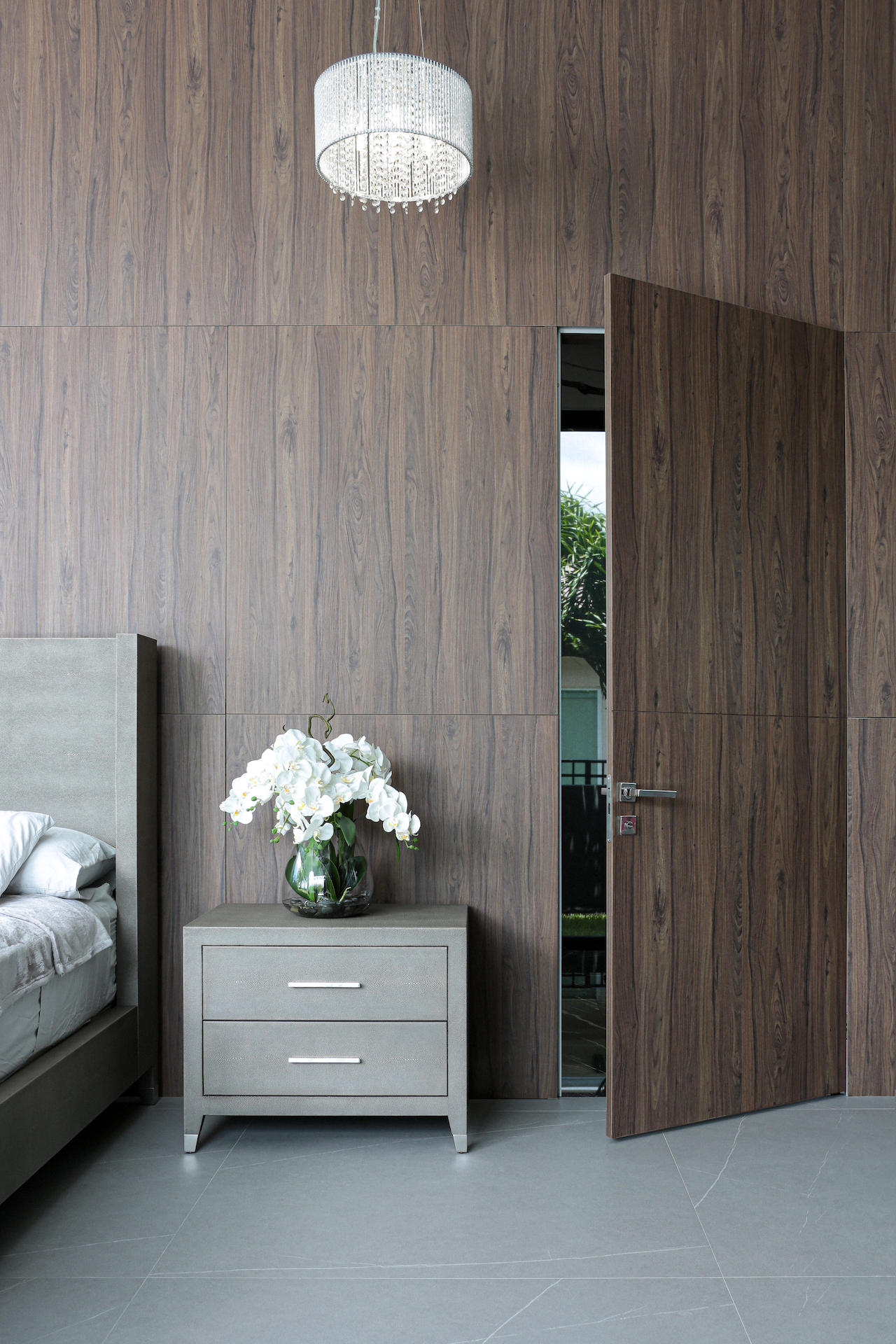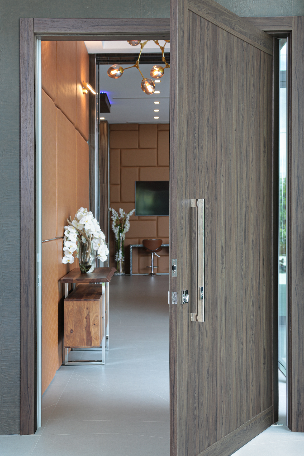 Dayoris used rich dark Stained Walnut Veneers to manufacture these oversized Filo Doors. The master bedroom was designed with an oversized Filo Muro Frameless Door closing flush against a matching paneled veneer wall. Brilliant Square Chrome Italian Hardware was installed in order to stand apart from and showcase the oversized Walnut Veneer Doors. Behind the bar Dayoris installed a 3D, LED backlit wall panel system, using a heavily grained German Laminate.