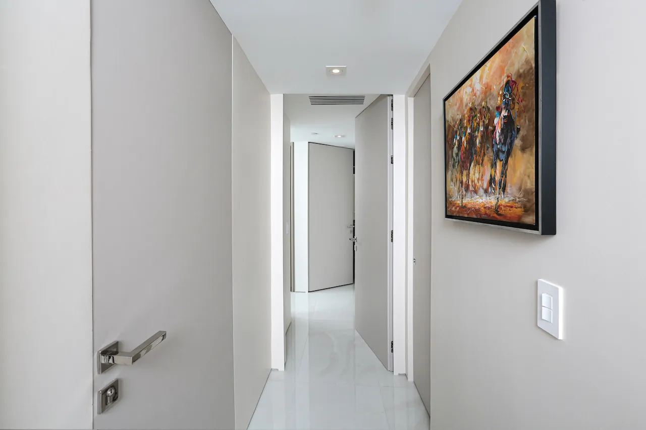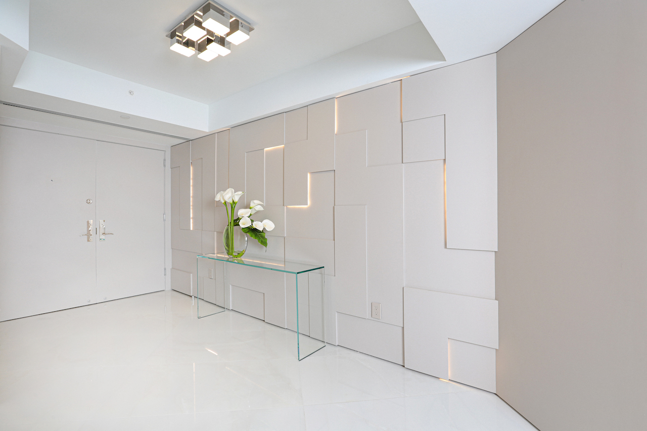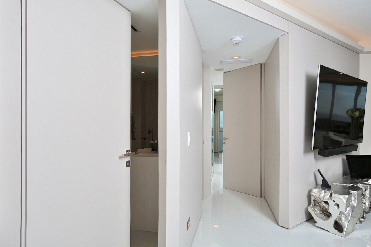 Brazilian Architectural firm ARCHITEXTURE designed this contemporary hi-rise apartment using a combination of DAYORIS European Lacquer, Filo Muro, floor to ceiling doors. These flush frameless doors were manufactured to work in coordination with the custom backlit “3D” paneling installed along the entrance wall of the apartment. The living room wall paneling was installed using a stained wire brushed Italian oak Veneer incorporated with mirror. The design intent of the Dayoris Flush Doors and mirrored wall paneling was to bring a sense of height and volume to the apartment. To further enhance the feeling of volume the apartment was designed without baseboard, incorporating a Fry Reglet reveal.