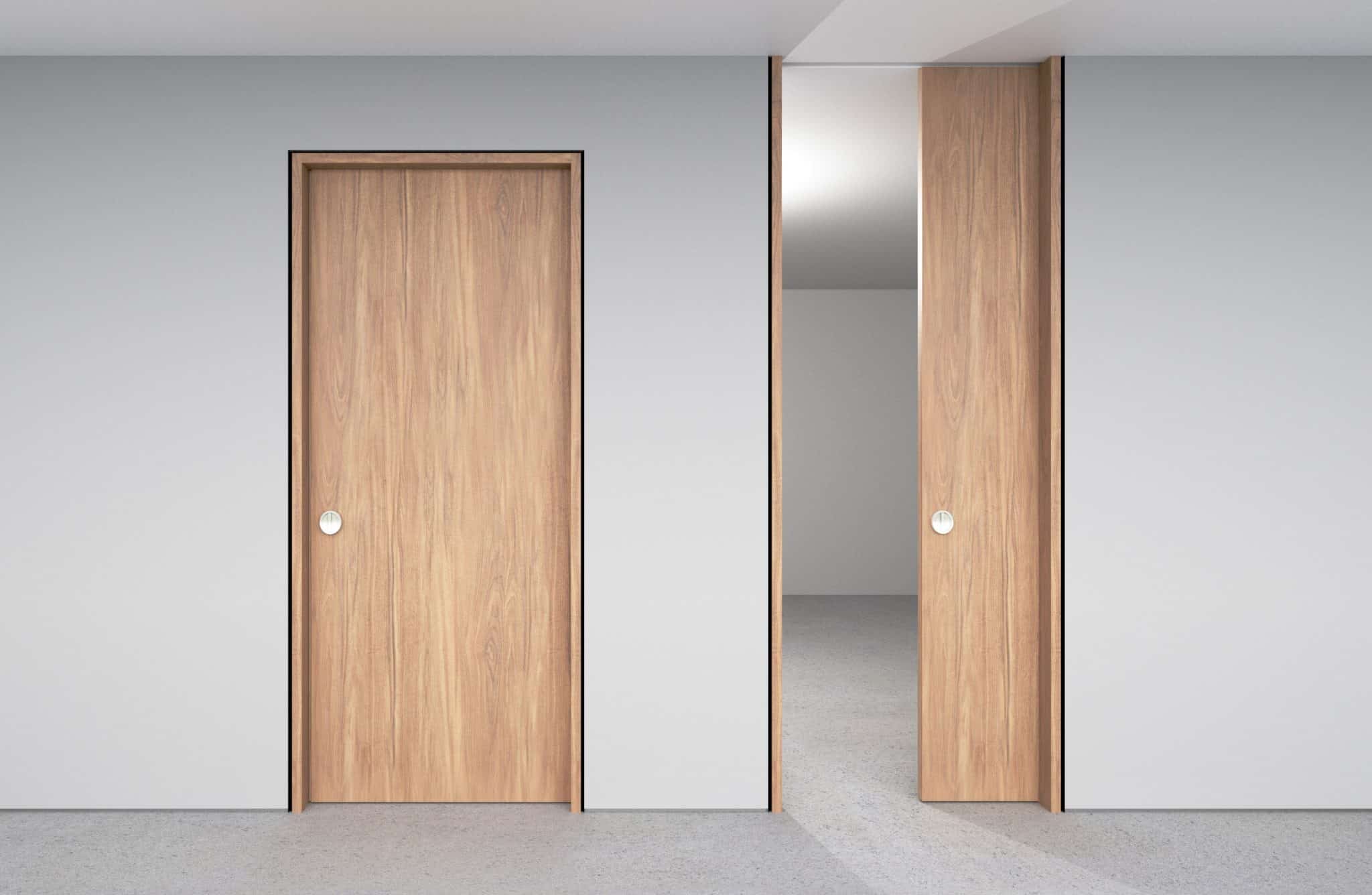 Our Modern Pocket Door features high pressured Italian laminate, selections of reconstituted wood veneers, matte and high gloss finishes and lacquered paint in an array of colors.