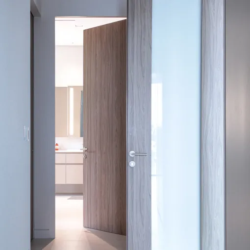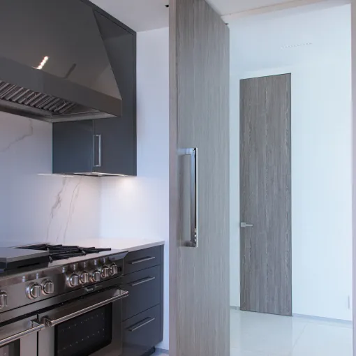 Hawaiian Modern Doors Dayoris Filo Muro, floor to ceiling, doors with heavy grained German Laminated OAK finish.