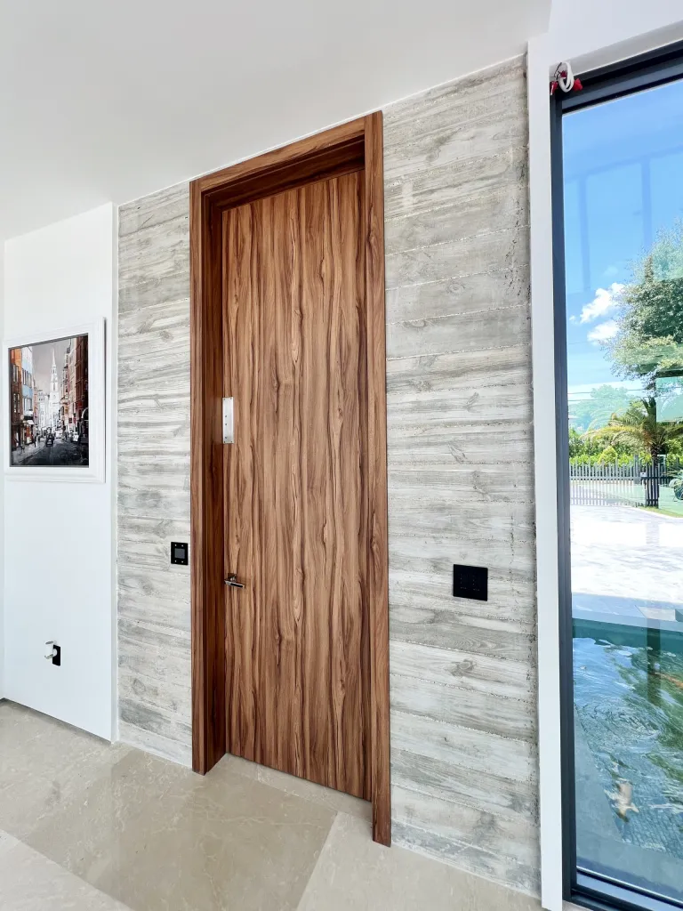 The DAYORIS Telaio Door emphasizes the shadow effect of a multi plane profile between the door and casing. Once installed the DAYORIS Telaio modern door presents itself with a completely finished, richly defined, wrap around wood casing and jamb that is adaptable to any wall thickness.